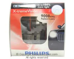 9008(H13) Extreme Vision 2-PackGet the most light on the road with Philips X-tremeVision upgrade headlightsFeel safe, drive safe- Choose Philips X-tremeVision headlight bulbs if you are looking for maximum light output from halogen bulbs. Philips X-tremeVision bulbs offer up more vision by offering a beam that's longer than the beam produced by a standard halogen headlight. This makes Philips X-tremeVision a perfect choice for drivers who want to see farther. Philips X-tremeVision is engineered with state-of-the-art technology for ultimate performance and more light where it matters the most.