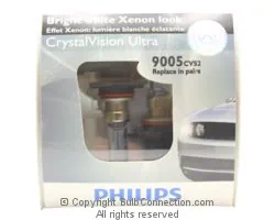 9005 Crystal Vision Ultra 2-Pack Philips CrystalVision halogen headlamp upgrades the style of your car with 4300K bright white light. With the blue coating and the silver top finishing, your car will look more stylish Bright white light to see and to be seen