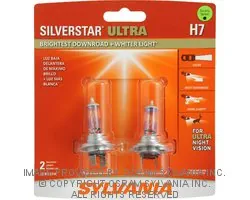 SilverStar ULTRA. The SYLVANIA SilverStar® ULTRA High Performance halogen headlight is our brightest downroad and whiter light. The combination of our furthest downroad, more sideroad, and whiter light helps the driver achieve more clarity helping to make night driving a less stressful, more comfortable experience. SYLVANIA achieves this using a specially designed filament, proprietary gas mixture as well as a lamp coating that makes a brighter downroad light and shifts the color temperature towards a whiter light. BRIGHTEST Headlight = MOST Downroad; Whiter light for added clarity; Manufactured by trusted OEM light source supplier; Legal for on road use; Lights dim over time, replace in pairs for optimal performance. |