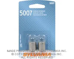 The Amazon ASIN for this Sylvania Automotive SYLVANIA 5007 Basic Miniature Bulb, (Contains 2 Bulbs) replacement lamp is B000J2NZ06. Other order codes that the Sylvania Automotive 5007.BP2 replacement bulb may be referred to as are SYLVANIA 5007 Basic Miniature Bulb, (Contains 2 Bulbs), SYLVANIA5007BasicMiniatureBulb,(Contains2Bulbs), SYLVANIA/5007/Basic/Miniature/Bulb,/(Contains/2/Bulbs), SYLVANIA-5007-Basic-Miniature-Bulb,-(Contains-2-Bulbs), 5007.BP2. The manufacturer continuous use average life rating for this Sylvania Automotive 5007.BP2 bulb is 800 hours. The color temperature of this replacement bulb is 2800 degrees Kelvin. The rated lumens value of the Sylvania Automotive SYLVANIA 5007 Basic Miniature Bulb, (Contains 2 Bulbs) replacement lamp is 50.