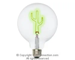 Green CactFILAMENT Filaments are designated by a letter combination in which C is a coiled wire filament, and CC is a coiled wire that is itself wound into a larger coil. Numbers represent the type of filament-support arrangement. This TCP FG40CACTUSBD Bulb has a Green Cact filament. |