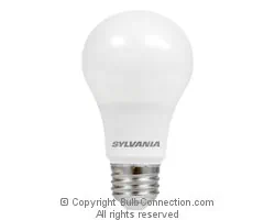 The manufacturer continuous use average life rating for this Sylvania LED9A19DIMO835URP lamp is 15000 hours. The color temperature of this replacement lamp is 3500 degrees Kelvin. The rated lumens value of the Sylvania LED9A19DIMO835URP replacement lamp is 800. The color rendering index of the Sylvania LED9A19DIMO835URP replacement bulb is 80. The Sylvania LED9A19DIMO835URP replacement bulb has a Frosted finish.