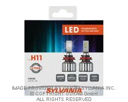 2 Pack. FOG & POWERSPORT. FOR OFFROAD USE ONLY. LED bulbs are an acceptable retrofit for a Fog light application and are not federally regulated, state and local regulations may vary. SYLVANIA LED H11 Fog & Powersports Bulbs (2 Pack) SYLVANIA LED Fog and Powersport LED bulbs let you update your vehicle’s lights with the clarity and performance that LED lighting technology brings! Legal for on road use as a fog light replacement in your car or truck, SYLVANIA LEDs cut through foggy conditions on the road ahead. Available as an off-road upgrade to your powersport headlights, LED headlight bulbs deliver enhanced clarity and contrast to see what obstacles lie on tough terrain and trails. Engineered to provide a superior 6000K white light, as well as style and durability, the SYLVANIA LED Fog and Powersports bulbs will be sure to turn heads. These direct LED replacement bulbs are made with high performance materials ensuring their durability and performance. FEATURES SUPERIOR ILLUMINATION: 6000K cool-white light provides better clarity to see what obstacles lie ahead RELIABLE: Built with aviation grade aluminum and turbo-cooled to maximize life, LED design withstands temperature and shock for optimal performance EASY DIY INSTALLATION: A direct replacement for fog bulbs in cars and trucks or headlight bulbs for off-road powersports. No polarity, compact design LONG LASTING DESIGN: Backed by a 5-year limited warranty, the rugged design is built to outlast halogen fog bulbs SMART MAINTENANCE: Always replace bulbs in pairs to ensure equal brightness and color SAFETY: High-quality SYLVANIA bulbs are designed to perform to all relevant safety standards set for the lighting application TRUSTED BRAND: SYLVANIA is a trusted OEM automotive lighting manufacturer, with over 100 years of superior optical engineering experience SPECIFICATIONS