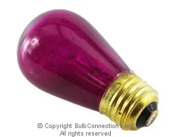The manufacturer continuous use average life rating for this Bulbrite 11S14TPK lamp is 5000 hours. The Bulbrite 11S14TPK replacement bulb has a Transparent Pink finish.